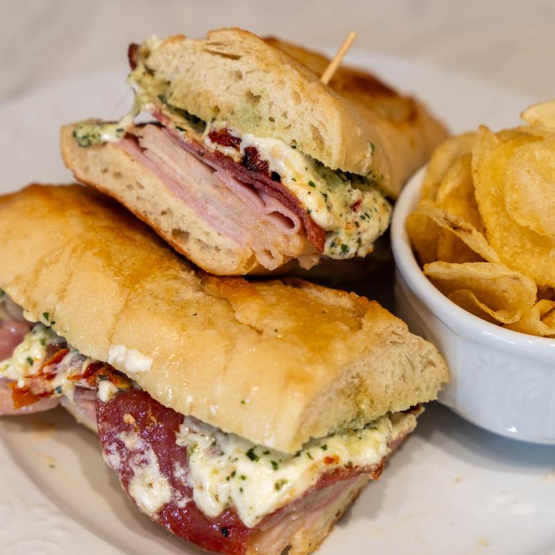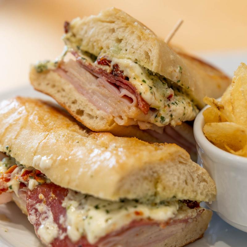 As the day progresses, lunch takes center stage with an array of gourmet sandwiches crafted from artisan bread with fresh ingredients. Guests can enjoy mouthwatering combinations like the Cuban sandwich with ham, roasted pork, mustard, Swiss cheese, and pickles or a classic Caprese sandwich with tomato confit, mozzarella, and fresh basil pesto drizzled with balsamic glaze. Each sandwich is accompanied with chips. You can also pair one of our delicious sandwiches with a bowl of soup or a crisp salad, for a perfect midday meal.